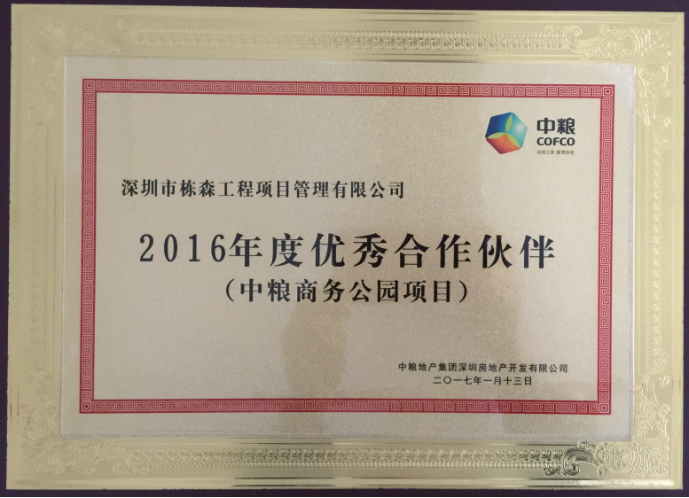 中糧地產(chǎn)集團(tuán)深圳房地產(chǎn)開發(fā)有限公司2016年度優(yōu)秀合作伙伴