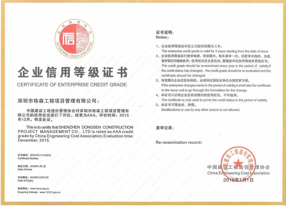 中國建設(shè)工程造價(jià)管理協(xié)會企業(yè)信用等級AAA