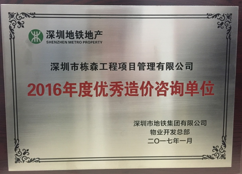 深圳市地鐵集團(tuán)有限公司物業(yè)開發(fā)總部2016年度優(yōu)秀造價(jià)咨詢單位